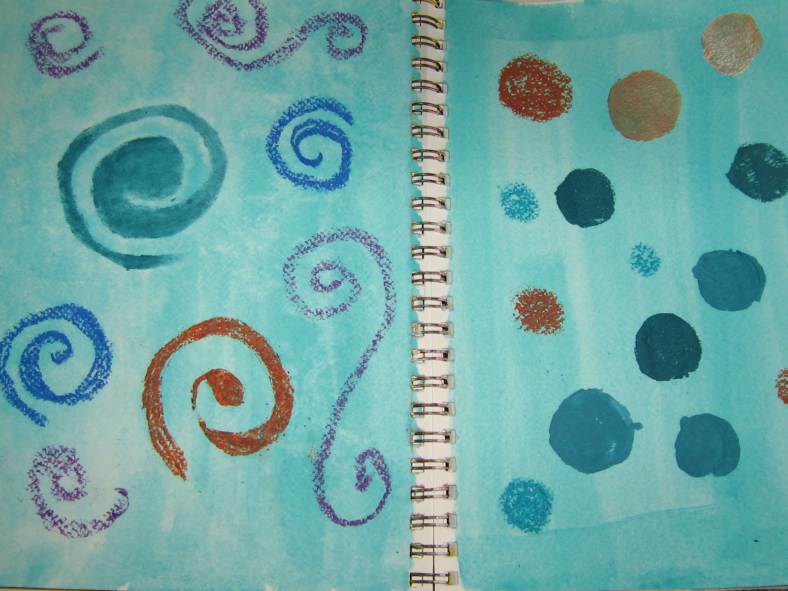 Resists were oil pastels (loosely applied to let background color show through), acryllic dabber